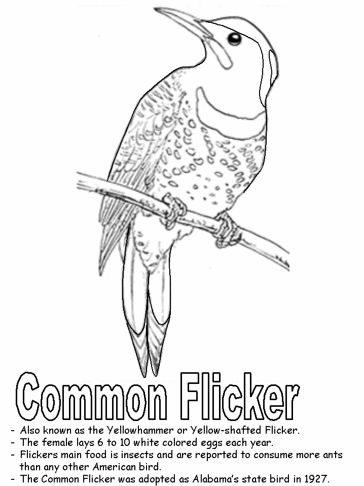 Click on the Alabama Common Flicker (Yellowhammer) coloring page below to see it in its own window (close that window to return to this screen) OR Right click and save image to your hard drive to print from your own  image software at your convenience.
