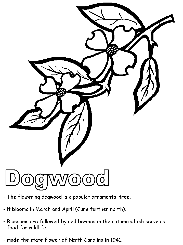 Click on the North Carolina Dogwood coloring page below to see it in its own window (close that window to return to this screen) OR Right click and save image to your hard drive to print from your own  image software at your convenience.