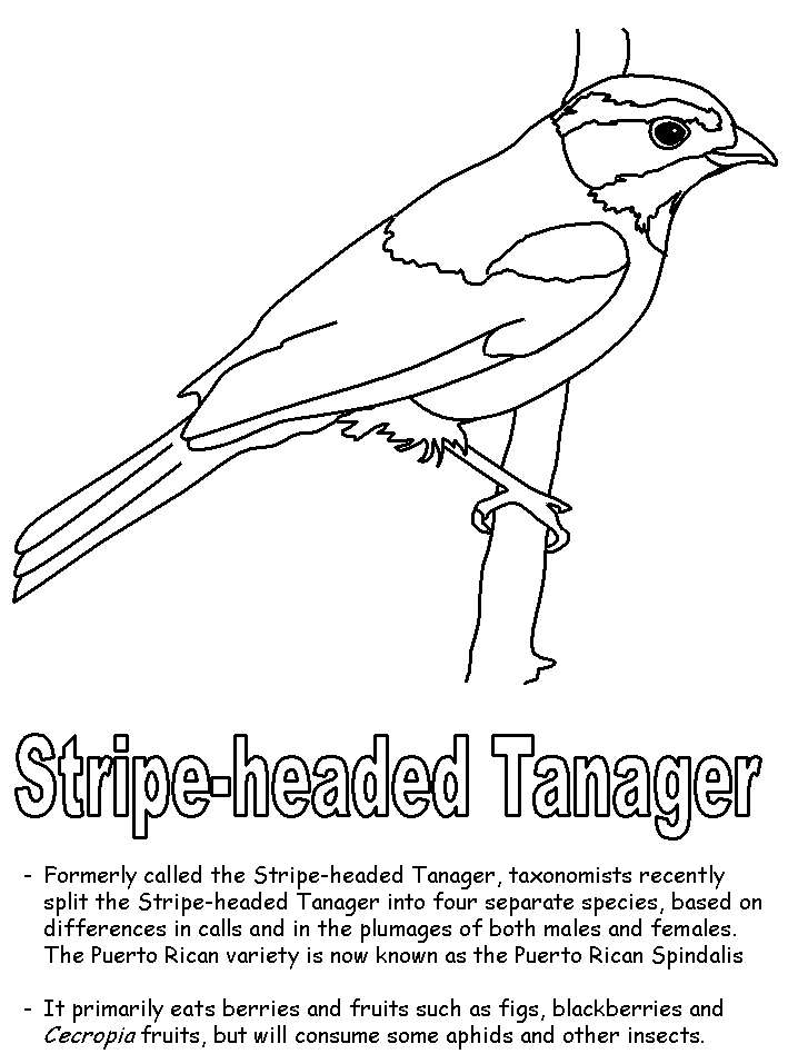 Click on the Puerto Rican Stripe-Headed Tanager coloring page below to see it in its own window (close that window to return to this screen) OR Right click and save image to your hard drive to print from your own  image software at your convenience.