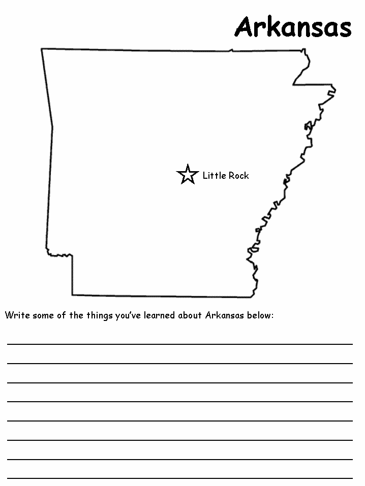 Click on the Arkansas state map activity worksheet below to see it in its own window (close that window to return to this screen) OR Right click and save image to your hard drive to print from your own  image software at your convenience.
