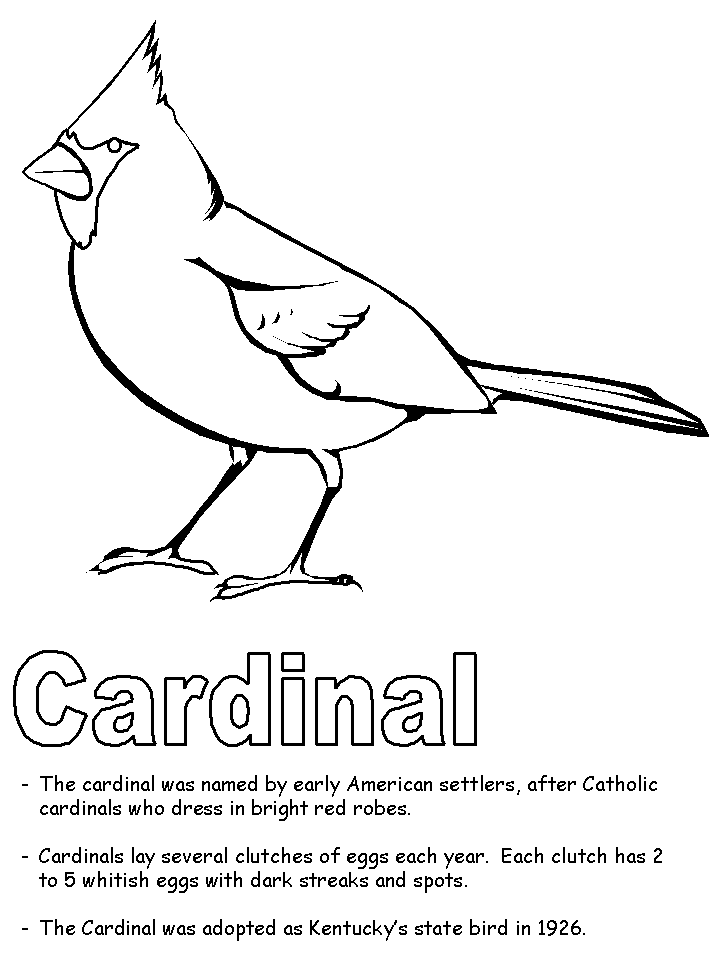 Click on the Kentucky Cardinal coloring page below to see it in its own window (close that window to return to this screen) OR Right click and save image to your hard drive to print from your own  image software at your convenience.