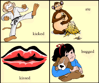 - When the child has mastered replacing a single card, try removing two of the cards (maybe kissed and dinosaur in our example above). Then remove three, etc. Progressively make the sentences longer until they are successfully replicating complex sentences -- For example, "The happy dinosaur and the green monster ate a red apple."